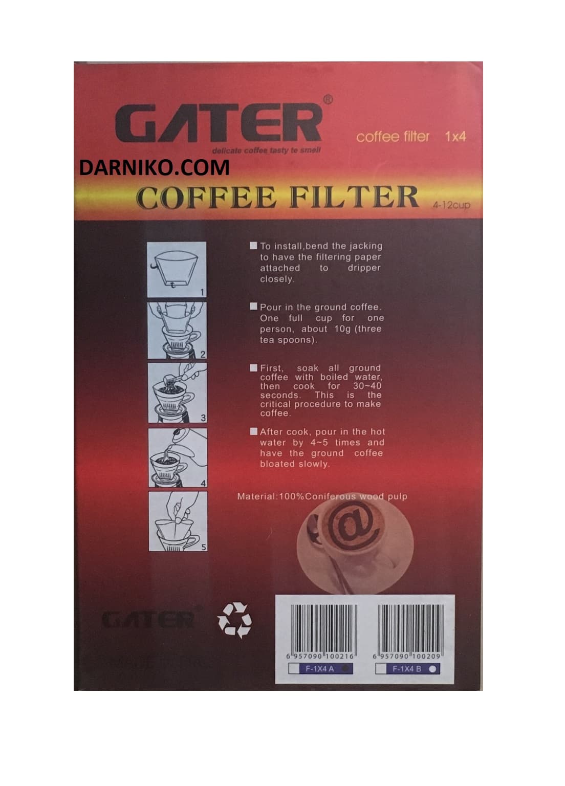 فیلتر کاغذی وی V60 سایز 103 مخروطی سفید برند گاتر GATER مناسب برای دم کردن قهوه به وسیله قهوه ساز V60 و قهوه جوشهای خانگی سایز 4 همچنین انواع دریپرها (قهوه جوشهای چکهای) میباشد.